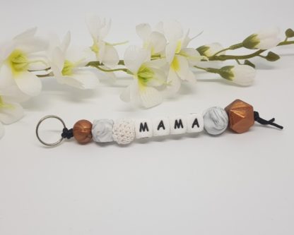 Deze leuke sleutelhanger bestaat uit koperen en marmeren siliconen kralen. Daarnaast wordt er nog een gehaakte kraal aan toegevoegd en is het geregen op sterk zwart satijndraad. Het is ook mogelijk om zonder naam te bestellen, vul dan bij het veld ‘Naam’ NVT in. Er is de keuze uit witte, houten of zwarte letterkralen.