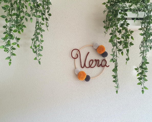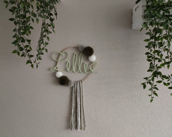 Ben je op zoek naar leuke decoratie voor de baby- of kinderkamer? Of naar een leuk kraamcadeautje? Deze leuke punnikhanger bestaat uit een stevige houten ring met punniknaam en zes pompons. De diameter van de houten ring is ca. 25 cm. Je kunt de kleuren van de naamhanger zelf samenstellen, kies voor grote of kleine pompons of met / zonder sliertjes. Zo is iedere punnikhanger uniek en met de hand gemaakt.
