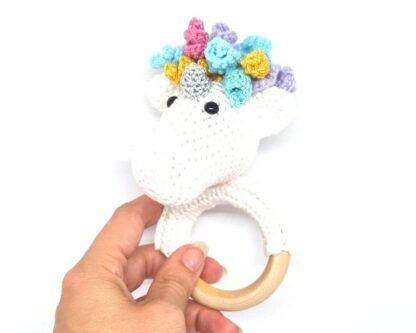 Gehaakte rammelaar in de vorm van een eenhoorn. De rammelaar is met de hand gemaakt en ideaal als kraam cadeau of tijdens een babyshower. In het hoofdje is een rammelkraal verwerkt, waardoor de eenhoorn subtiel rammelt. Hierdoor is het interessant voor je baby om te gebruiken. Door de houten ring is de gehaakte rammelaar gemakkelijk vast te houden in kleine handjes.