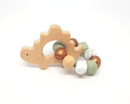 De siliconen kralen zijn gemakkelijk schoon te maken met water of een vochtig doekje. Het houten figuur is minder bestand tegen water en hoeft in principe niet gereinigd te worden. Een vochtig doekje voldoet.