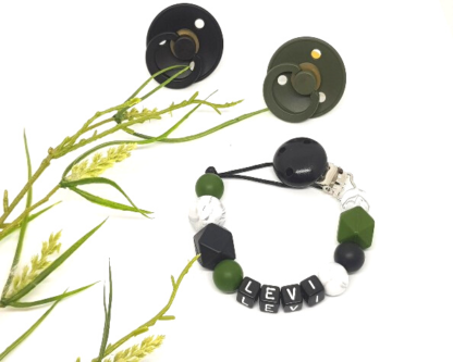 # Speenkoord Levi is gemaakt van dennen groene, marmeren en zwarte siliconen kralen. De kralen zijn natuurlijk BPA-vrij en vrij van andere chemische stoffen. Deze zijn gecertificeerd en veilig voor je kindje. Het is afgewerkt met zwart satijndraad en een zwarte houten clip;